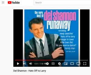 Del Shannon followed up his hit song with another track entitled “Hats Off to Larry”. The song’s lyrics were an exercise in Schadenfreude for the protagonist disguised as a tribute to the man who broke the heart of the woman who broke his heart. Del Shannon would go on to have later US hits, though he had much more success in the United Kingdom, where he basically was the counterattack to the British Invasion that dominated the US pop charts in the mid-1960s.