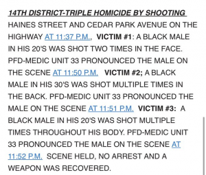 Steve Keeley of Fox29 news reported on a triple murder in the West Oak Lane neighborhood, and included the press release from the Philadelphia Police Department. The press release identified the victims as three “black males.”