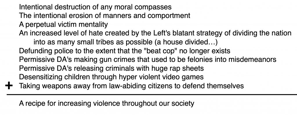 In addition to a distinct lack of a moral compass for many Americans, the divisiveness of the media and our government “leaders” contributes to this problem. Everything is a means of dividing the nation, of destroying our culture, or eroding trust or tearing down our institutions. Race, color, creed, voting patterns, level of wokeness, zip code, punctuality, work ethic, and a myriad of other things are all tools used by the Left to divide the nation. The Left has created a victim mentality in the Once-United States in which one’s difficulties are always someone else’s fault, not the results of poor personal choices. If bad things have happened to me, it is your fault, and my moral relativism tells me it is okay to lash out against you.