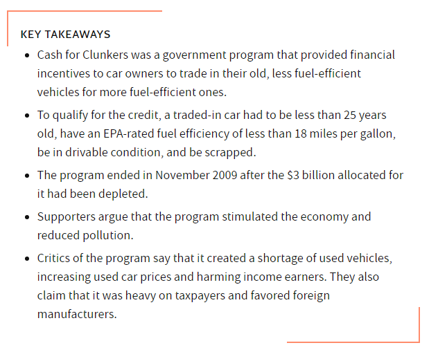 At the time, I called it welfare for the well-to-do, and I was right. Running during the so-called “great recession”, the only people who could afford to buy a new car were the ones whose jobs had survived the cuts, knew that their jobs were secure, and had good enough credit to qualify for a new car loan. In other words, they were the people during the “great recession” who didn’t need help from the government. Only 49% of the new vehicles sold through the cash for clunkers program were manufactured in the United States.