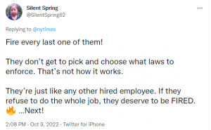 The left are, of course, aghast. A Twitter user styling herself Silent Spring wasn’t silent at all in giving her opinion: she wants all of those sheriffs fired.