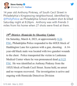 Then there was this tweet, from Fox 29 News’ Steve Keeley, telling us about one of the victims of the weekend’s violence.