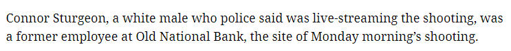 Connor Sturgeon, a white male who police said was live-streaming the shooting, was a former employee at Old National Bank, the site of Monday morning’s shooting.
