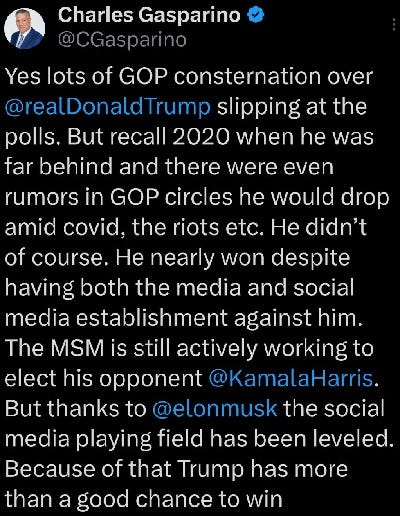 I believe he is right. What is emerging is Trump going back to his roots while growing his audience. Jennifer Oliver O’Connell wrote, “The legacy media is so focused on rebranding Kamala Harris and running interference for Tim Walz that they cannot even recognize the brilliance of this pivot. X is the one platform that isn’t working overtime to either ignore, misrepresent, or drown out Trump’s campaign and message. Much to their chagrin, with this X interview, Trump has blown a hole through their propaganda wall and reached past to voters that they had no idea existed.”