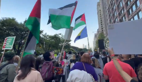Outside of the United Center for the Democratic National Convention Pro-Palestine protestors shout “GO HOME OR WE ARE GONNA BRING THE WAR HOME”