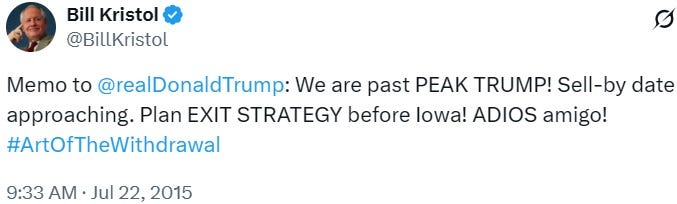 Kristol said, “We are past PEAK TRUMP! Sell-by date approaching. Plan EXIT STRATEGY before Iowa! ADIOS amigo! #ArtOfTheWithdrawal.”