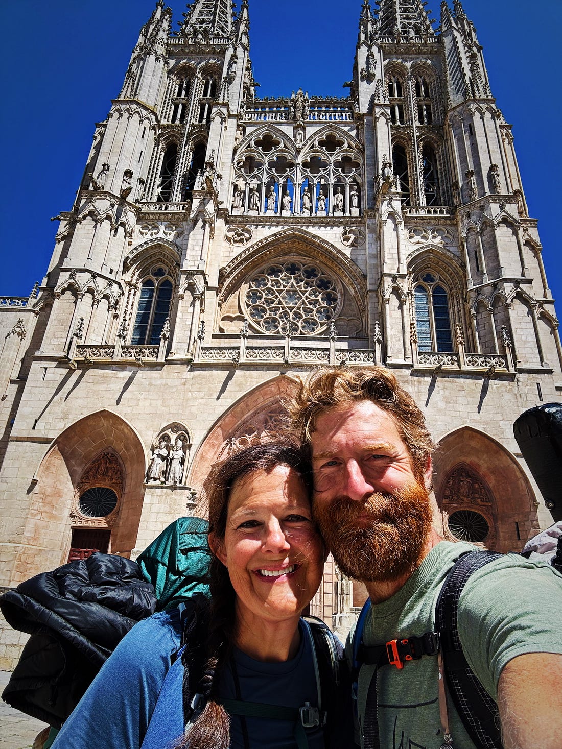 We arrive in the city of Burgos after a 14-mile walk. Although it feels like 14 million miles. Today is hot. We are sunburned, thirsty, and our skin is covered in a fine layer of crystalized salt from evaporated sweat.