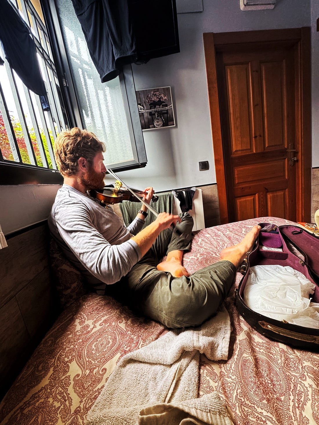 After a few songs. The day is over. I put the fiddle away. The light from our open windows dims as the last spears of orange sun fade behind the church spire of San Andres cathedral.