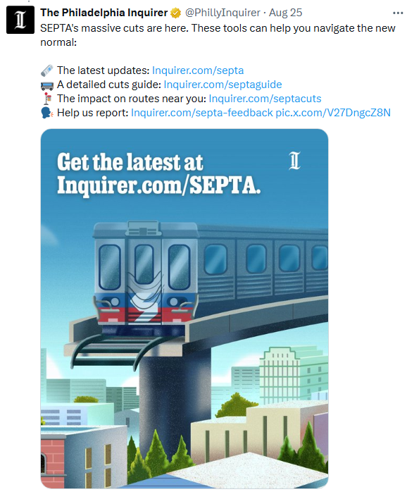 The biggest issue in foul, fetid, fuming, foggy, filthy Philadelphia at the moment is more state funding for the Southeast Pennsylvania Transportation Authority, or SEPTA, the mass transit agency which run buses, trains, trollies, and subways in the metropolitan area. SEPTA has a projected $213 million deficit, and has instituted significant service cuts to try to keep the operating expenses in line with projected revenues without the aid from Harrisburg for which they’ve been begging. My good friend Daniel Pearson and the Editorial Board of The Philadelphia Inquirer have been adamant that the Commonwealth must come through with money, or utter disaster will strike. Note how the elevated train comes to destroyed tracks in a tweet from the newspaper!