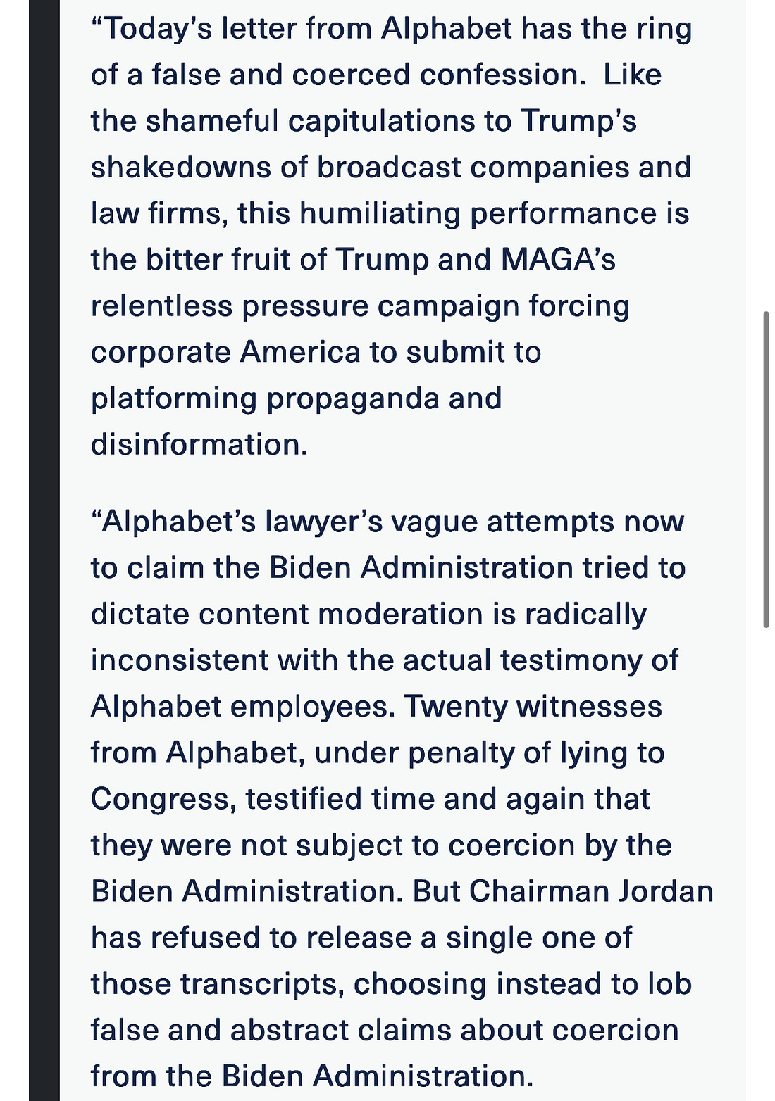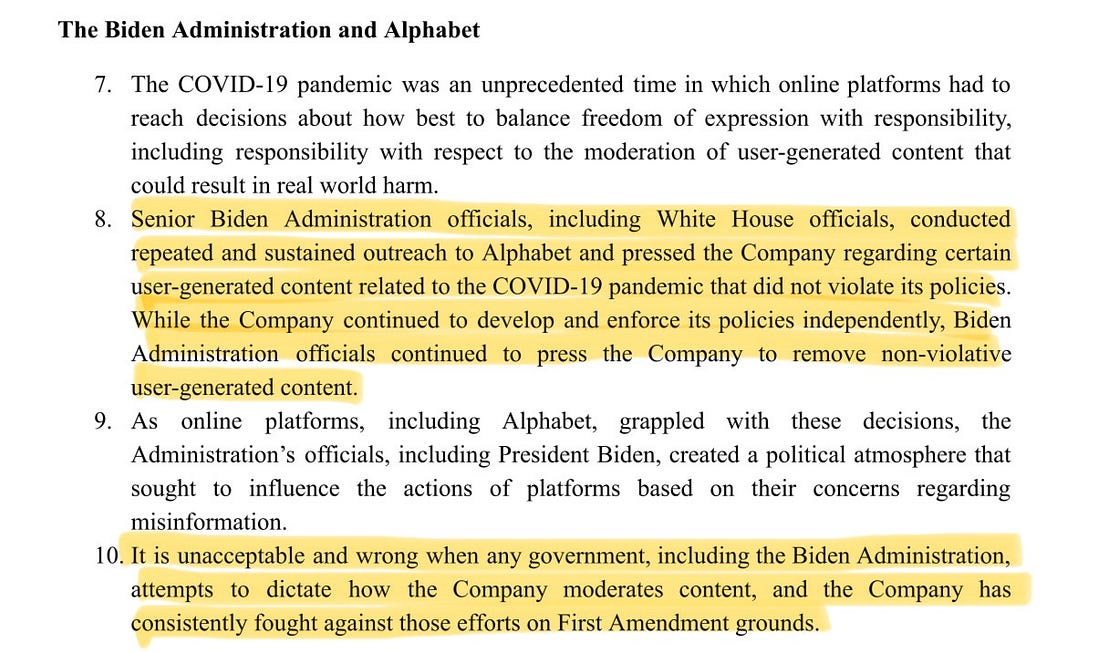 What did the “pressure” look like? Per Donovan, there was “repeated and sustained outreach” from White House officials urging takedowns of non-violative content—pressure Alphabet now disavows even as it maintains it enforced policies independently at the time.