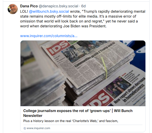 I asked the Inquirer’s Will Bunch, on Bluesky, if there was “any discussion in the newsroom concerning Mr Biden’s growing incapacity before it all blew up during the debate?” but of course I didn’t get a response.