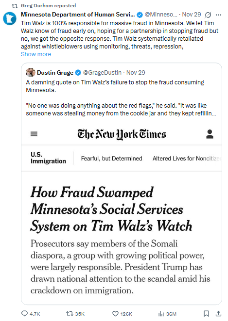 However now we have the stories, sourced from state workers, concerning how Governor Walz and the Minnesota state agencies ignored evidence of fraud perpetrated by Somali groups to raid federal funds. From The New York Times: