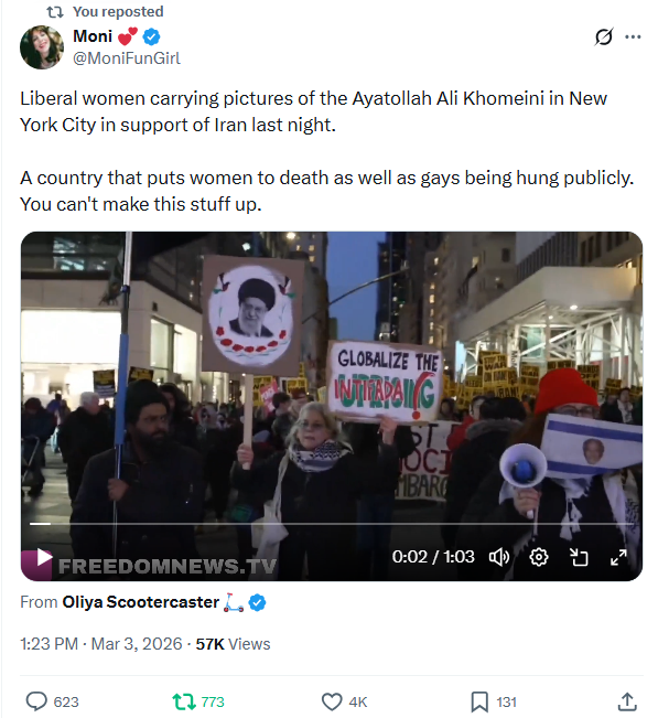 But at some point you have to wonder about the Westerners demonstrating in support of the now late Ayatollah Ali Khamenei and the oppressive Iranian government. Under the mad clerics, Iran was sponsoring anti-Western and especially anti-Jewish terrorism anywhere they could. The October 7th massacre was launched by Hamas, but they could only do so due to the monetary and war materiel support they received from Iran. Iran wanted the war to hold up the movement of Saudi Arabia to sign on to the Abraham Accords, because the last thing the mullahs wanted was peace between Israel and the Arab nations. Are American liberals so consumed with #TrumpDerangementSyndrome that they’d rather see girls executed for being raped, women slain for not wearing the hijab properly, and homosexuals publicly hanged by construction cranes than President Trump get a major foreign policy win?
