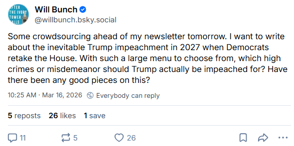 We noted on Monday The Philadelphia Inquirer’s far-left columnist Will Bunch’s skeet telling us that, assuming the Democrats take control of the House of Representatives following the elections this coming November, that President Trump will ‘inevitably’ be impeached. It took longer on Tuesday for Mr Bunch’s column to be published than I had guessed, 11:52 AM EDT, but finally it came out. It was the same laundry list of ‘high crimes and misdemeanors’ that the denizens of Bluesky always parrot, but really nothing new.