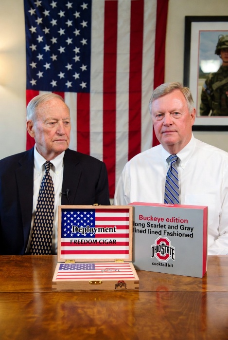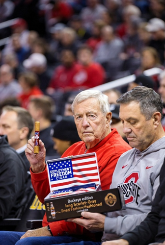 Front and center on THE Chuck’s table while watching the Ohio State Buckeyes men’s basketball team take on Michigan, listening to commentary from former Buckeye great, fellow St. Francis DeSales father, and friend Clark Kellogg, it sat with the Deployment Freedom Cigar: smooth, patriotic, wrapped in that signature barber-pole design with QR codes linking straight to the Declaration, Constitution, and Bill of Rights.