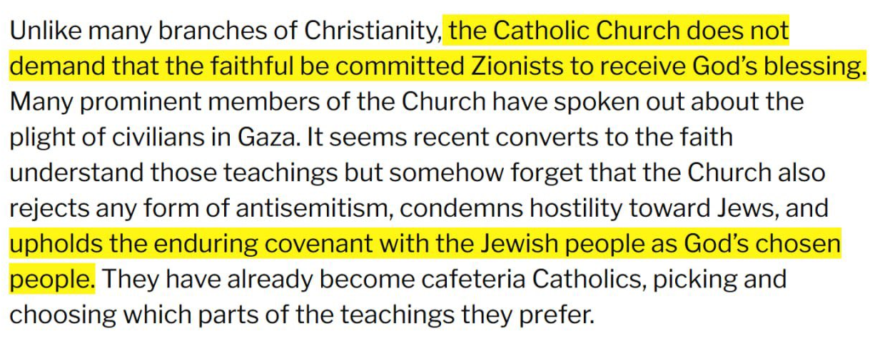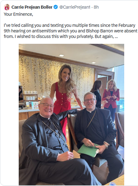 Now she’s trying to pick a fight with two Catholic bishops, Timothy Cardinal Dolan and Robert Barron which led Richard Hanania to tweet, “This woman seems to think the Catholic Church is some kind of global Walmart where you can just keep demanding to see the manager and yell at him for not being antisemitic enough.” 🙂