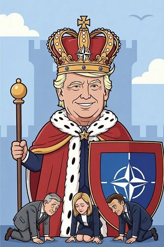 Me to Grok: Draw a cartoon of Trump as King of NATO. Have Starmer, Meloni and Macron bowing.