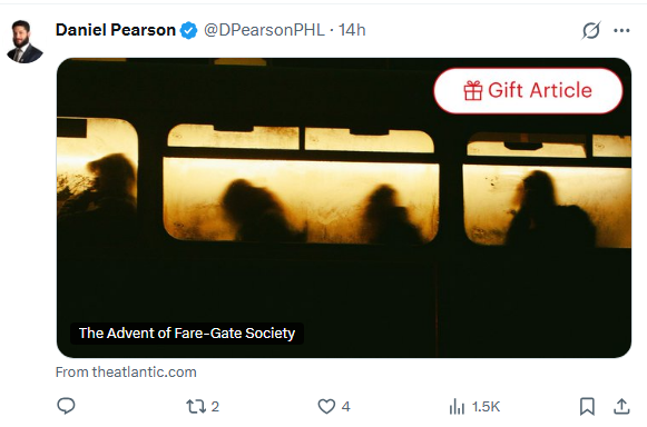 My good friend Daniel Pearson — OK, OK, I’ve never actually met him, but even though he’s mostly liberal, he’s a common sense and decent kind of guy, the kind of guy you’d be happy with whom to sit down and drink a cup of Wawa coffee — an editorial writer and columnist with The Philadelphia Inquirer gave his Twitter — I still refuse to call it ð — followers a gift article from The Atlantic, on a subject that’s near and dear to his heart, public transportation, and the plague of fare-jumping which has cost the Southeastern Pennsylvania Transportation Authority, SEPTA, millions of dollars in lost revenue, something which puts it in real jeopardy.