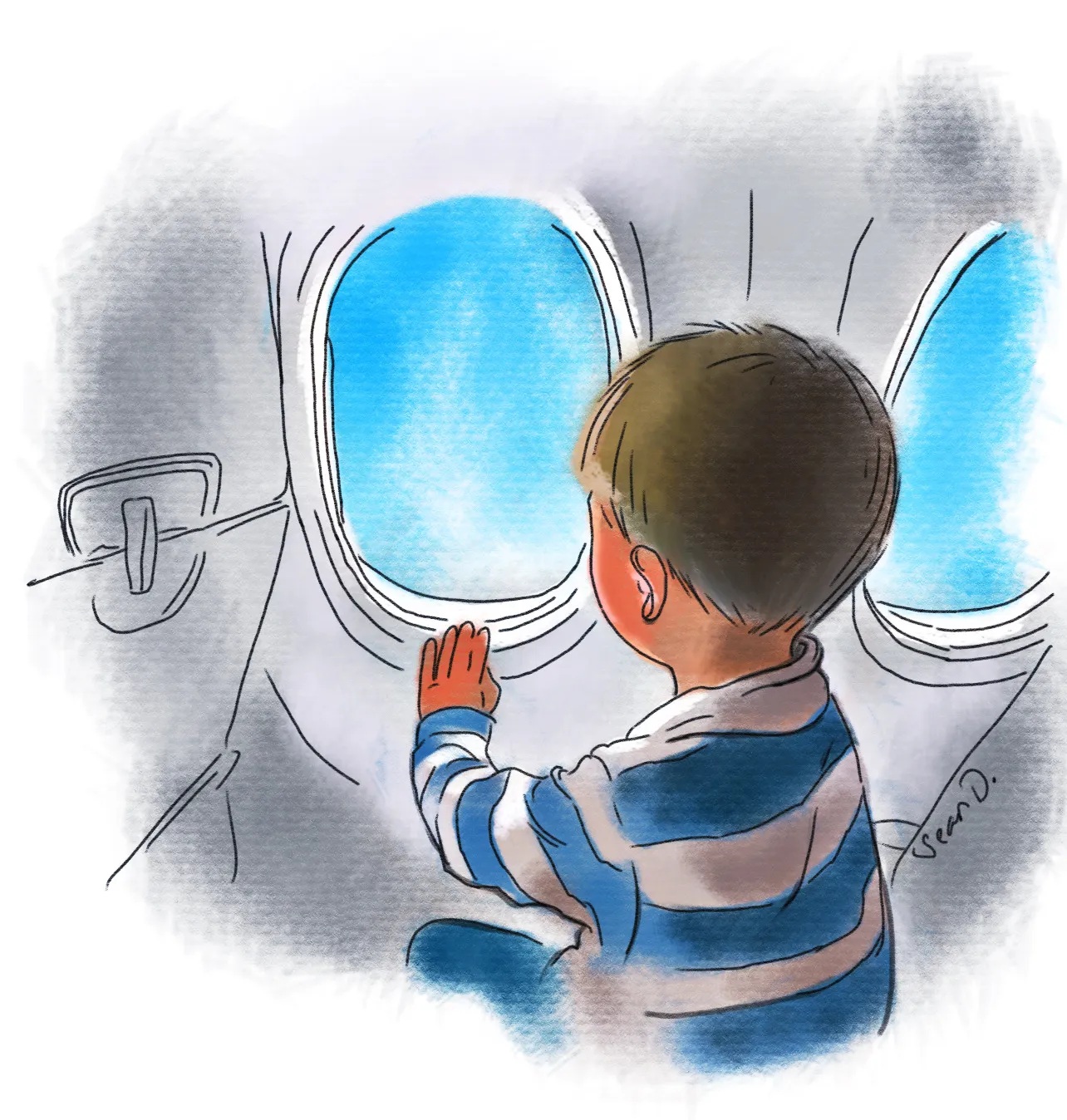 Our flight is uneventful, but the boy has millions of questions. He directs all questions and inquiries toward his mother. Whenever she answers—God bless her—she is met with yet another “why?” “how many,” or “what’s that mean?”