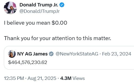 An appeals court decided that a half-billion fine for at best a $10 case might be a little excessive. No one in the media had the courage to call out reckless Judge Engoron for allowing this case to be brought to trial in the first place.