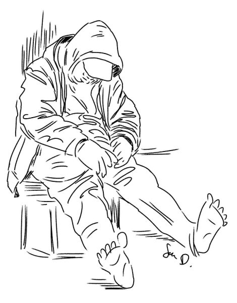 There I am, watching him. He sits on the steps of the Shell Station. A backpack beside him. His skin is rawhide. His beard is white.